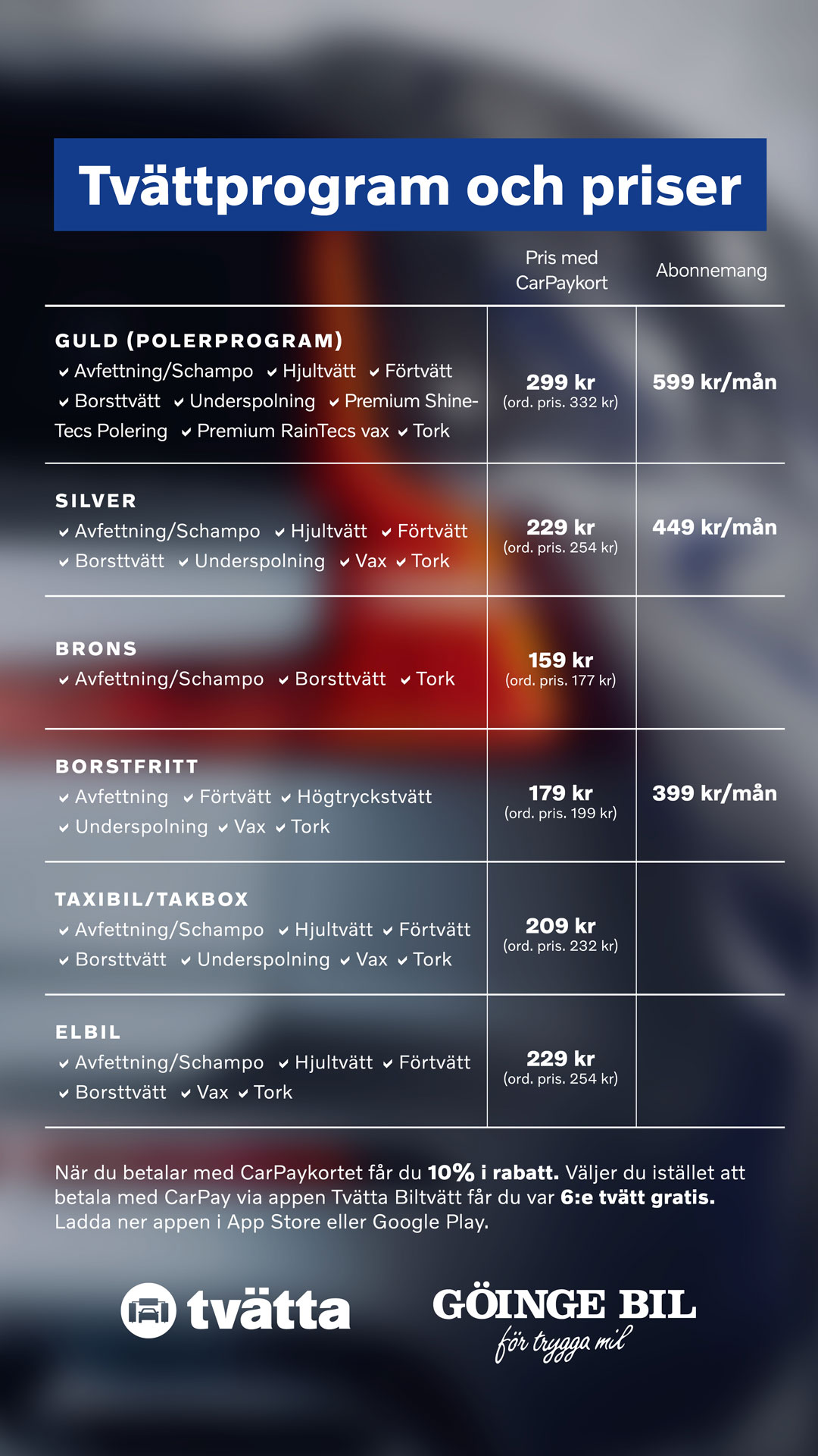 För oss på Göinge Bil är det viktigast att din bil blir ren och fin. Därför har våra biltvättar extra skonsamma borstar, heltäckande underspolning och lutande sidoborstar. Dessutom erbjuder vi specifik fältvätt, däckglans och premiumvaxer.